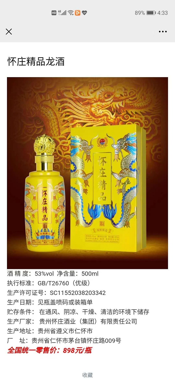 炎黄子孙,龙的传人 喝龙酒,怀庄精品龙酒,该酒采用传统酱酒酿造工艺“12987”酿造技术,固态发酵,古法精酿。闻其有粮香,清新自然,喝起来口感,清柔绵醇,幽雅细腻,酱香突出,回味悠长。怀庄精品龙酒,帝王黄,书本盒的包装,高端大气,瓶身更是尊贵典雅。扫码高,送人倍有面儿,很是适合节走亲访友,宴请,婚宴祝寿,都是富贵的象征。扫码高,市场零售价格稍高,喜欢的可以到各大批发市场了解购买。