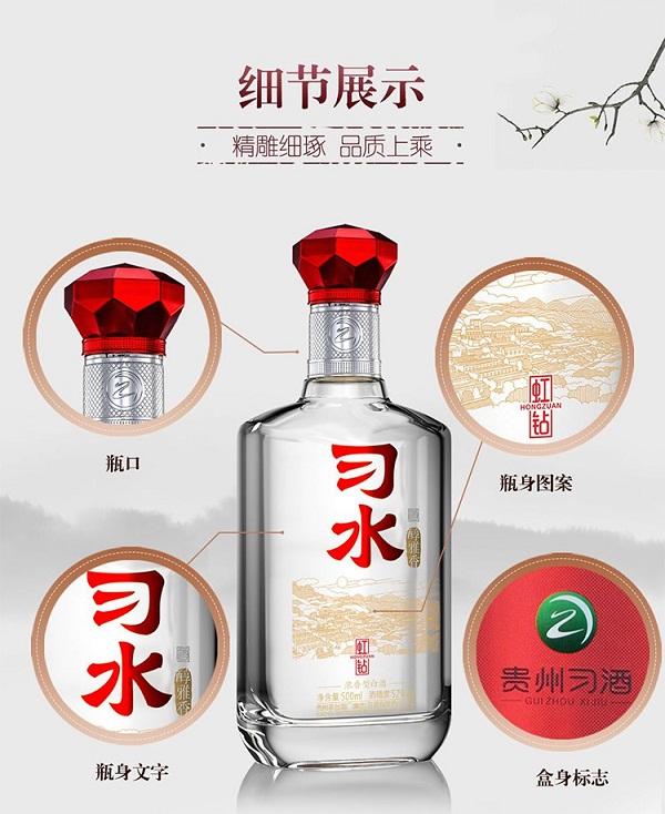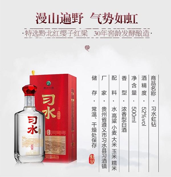 习水虹钻醇雅香采用30年窖龄发酵酿制,整体包装以习酒特选的黔北红缨子红粱为载体,采用红色色调,象征喜悦和热情。采美酒河赤水,选黔北糯红高梁,耐高温耐蒸煮,水火淬炼中,终成钻石品质,入口香浓,回味悠长,独享醇雅感受,红高粱晶莹剔透,漫山遍野,气势如虹,如习酒虹钻口感优雅,口味斑斓,享七彩人生,喜悦如虹。价格方面,京东官方价格为218元/瓶,折后整箱价为1151元/箱。
