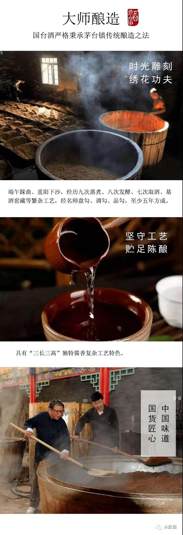 国台酒严格秉承茅台镇传统酿造之法,端午踩曲、重阳下沙,经历九次蒸煮、八次发酵、七次取酒、基酒窖藏等繁杂工艺,经名师盘勾、调勾、品勾,至少五年方成。具有“三长三高”独特酱香复杂工艺特色。团购、批发电话:18937621356(微信同号)