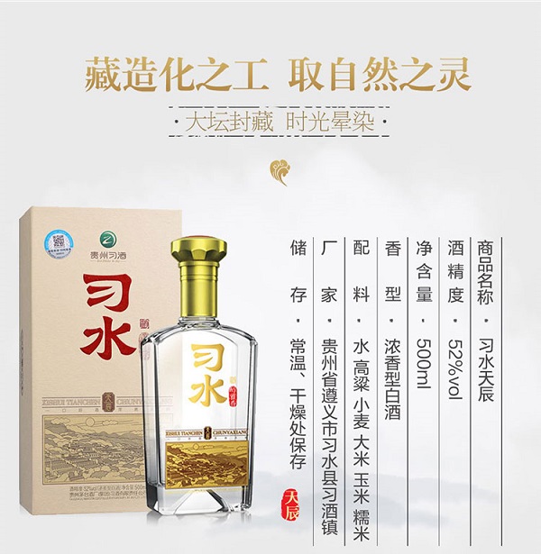 习水天辰醇雅香采用30年窖龄发酵酿制,整体包装以习酒特选的黔北红缨子红粱为载体,采用红色色调,象征喜悦和热情。采美酒河赤水,选黔北糯红高梁,耐高温耐蒸煮,水火淬炼中,终成钻石品质,入口香浓,回味悠长,独享醇雅感受,红高粱晶莹剔透,漫山遍野,气势如虹,如习酒天辰口感优雅,口味斑斓,享七彩人生,喜悦如虹。价格方面,京东官方价格为428元/瓶。团购/批发电话:13203710360(微信同号)
