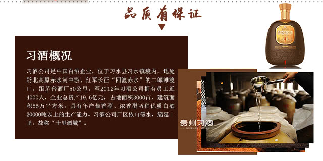 习酒公司始终秉承中国传统白酒的技艺精华,坚守纯粮固态发酵工艺,坚持“以诚取信、以质取胜、锐意创新、追求卓越”的质量方针,践行“无情不商、服务至上”的营销理念,致力于做精产品、做优质量、做好服务。