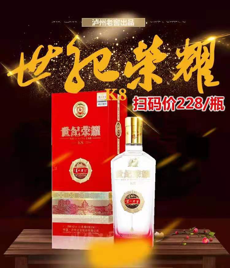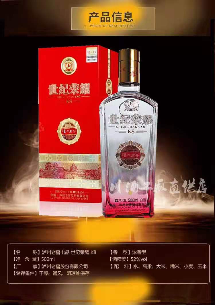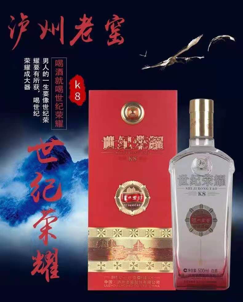 泸州老窖世纪荣耀K8,精选川南红高粱,泸州龙井泉水,数千年的传承工艺。古法酿制,30年持续酿造的老窖池,流畅自如的将自然力量转化成酒香。百年窖池,生态窖藏。使其窖香浓郁,口味丰满,入口甘美,绵甜净爽,酒体醇厚,香气优雅,回味悠长的独特风格。陈年佳酿,岁月生香,百年老窖,历史味道。
