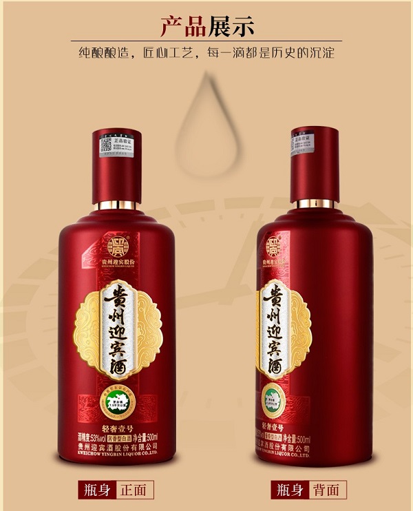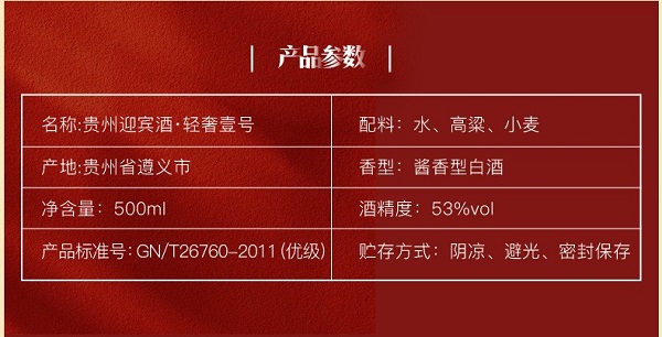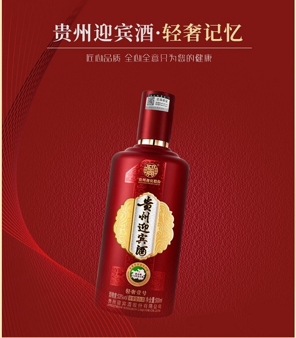 53度贵州迎宾酒轻奢壹号,传承传统酱香“12987”工艺酿造而成。使其色清透明,酱香突出,醇香馥郁,幽雅细腻,入口柔绵,清冽甘爽,酒体醇厚丰满,回味悠长的特点。大红色外盒包装高端大气,瓶身美观,无论是商务赠送,宴请招待,都是高大尚的选择。贵州迎宾酒轻奢壹号,市场零售价格不高,适合大众消费。整箱6瓶装京东官网指导价399元。 批发、团购:13203710360(微信同号)