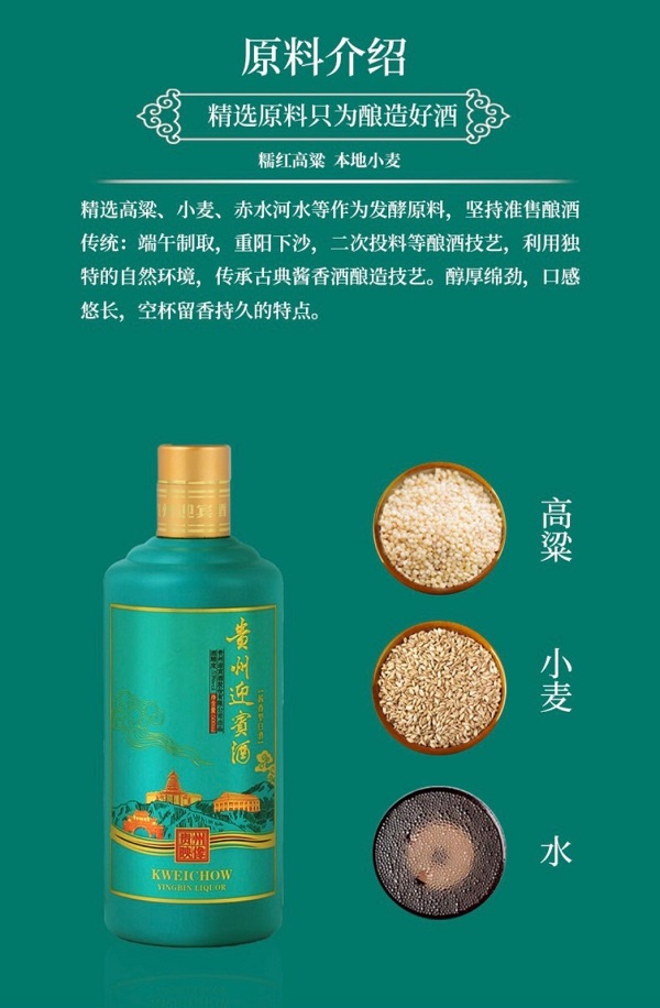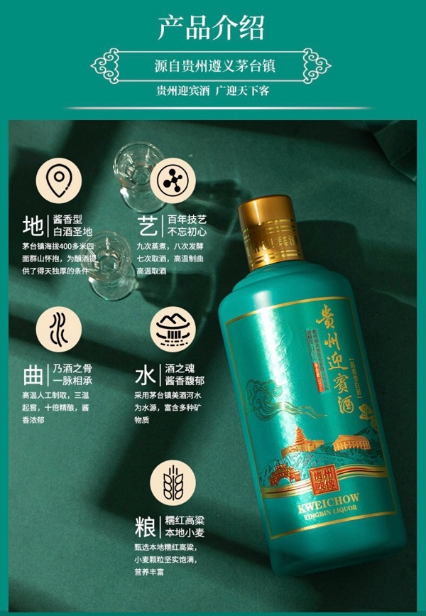 贵州迎宾酒,属大曲酱香型酒,它具有色清透明、酱香突出、醇香馥郁、幽雅细腻、入口柔绵、清冽干爽、酒体醇厚丰满、回味悠长的特点,是我国酱香型风格的典范。本品严格遵循茅台镇酱香酒的复杂工艺,端午制曲,重阳下沙,两次投粮,九次蒸煮,八次发酵,七次取酒。其中制曲、踩曲、堆积、馏酒、润粮、上甑、摊晾、下窖、下曲等环节处处别具匠心。每一瓶贵州迎宾酒都经过不同年份、不同轮次、不同风味特点的纯粮原酒进行组合调味,平衡酒体,不仅使酒精浓度把控53度,更能保持茅台镇酱香酒的风味特点。贵州迎宾酒酒贵州映像,京东官网单瓶零售价399元,市场价格不高,适合大众消费。 批发、团购电话:13203710360(微信同号)